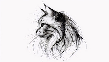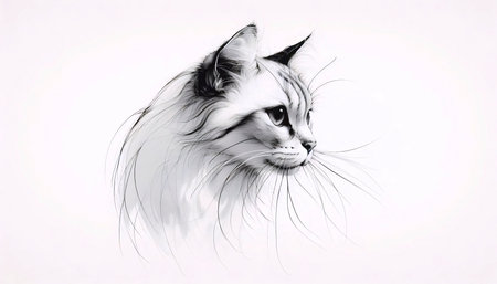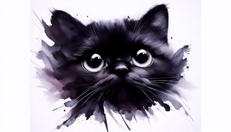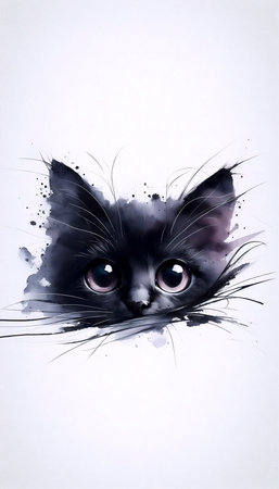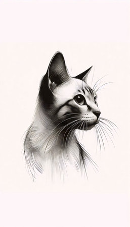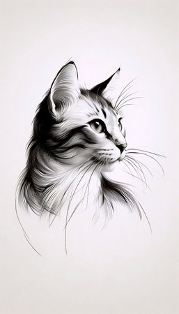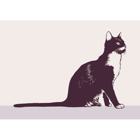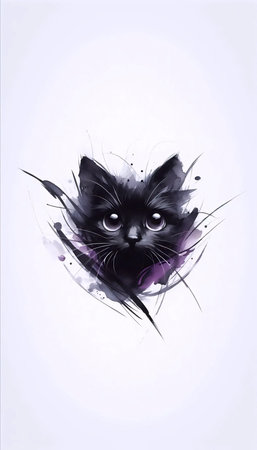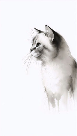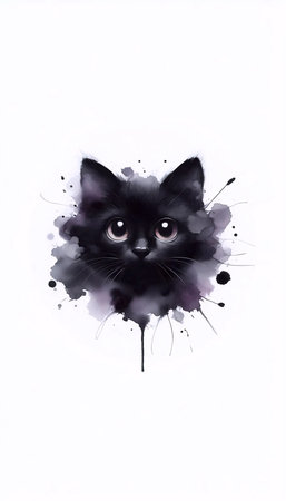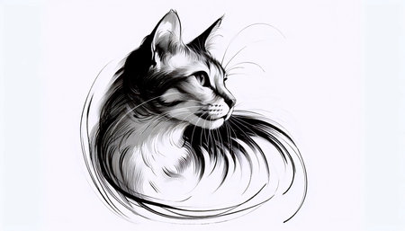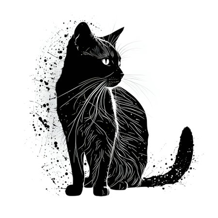 Elegant drawing of a charming stylized cat isolated on a white background. The feline is depicted with a smooth, continuous outline and situated against a dark ink splattered background, blending