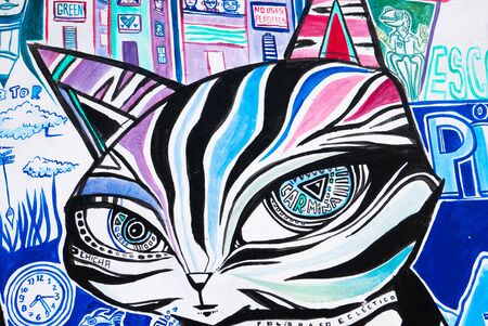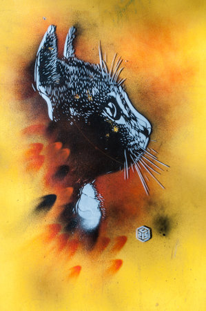 MULHOUSE - France - 3 November 2016 - graffiti of . cat on mailbox by the painter artist C215 in Mulhouse.