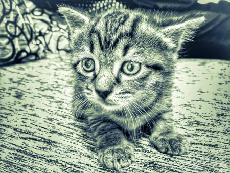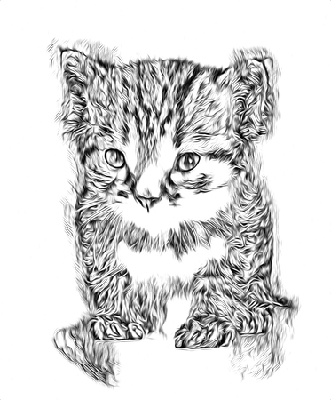 Tabby kitten. Cute furry cat. Home pet. Cartoon illustration isolated on white background. Black and white hand drawn sketch
