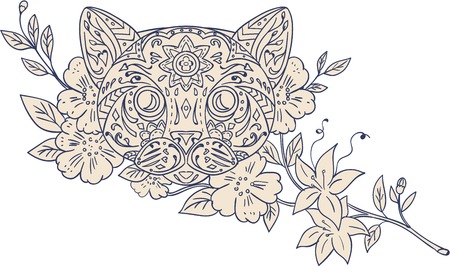 Mandala style illustration of a cat head with jasmine flowers viewed from front set on isolated white background.