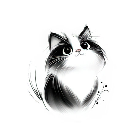 Illustration of fluffy black and white cat with piercing eyes. Drawing of a tuxedo kitten with soft fur texture. Concept of pet portrait, feline beauty, animal art. Isolated on white background