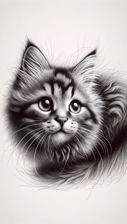 street cat adopted by a family, kitten about 3 months old black and white drawing