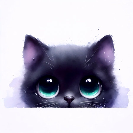 Cute black cat with green eyes. Vector illustration isolated on white background.