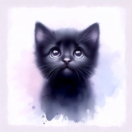 Whimsical black cat with blue eyes. Vector illustration with playful pink splashes and blots on dark background.