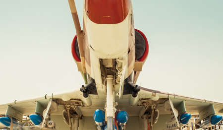 Part of the wing of a jet plane with intimidating missiles. Black and white photo of military equipment.