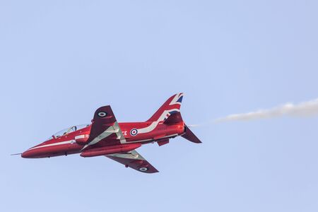 ABU DHABI, UAE - NOV 24, 2016: Royal Air Force Aerobatic Team Red Arrows performs in an airshow over the Abu Dhabi Corniche