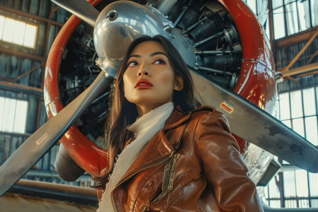 Confident Young Woman in Brown Leather Jacket Standing Before Vintage Airplane Propeller in Hangar AI Generative