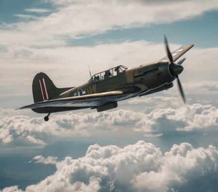 Vintage fighter plane flying amidst fluffy clouds, showing its detailed design and the vast sky