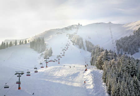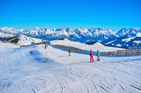 The skiers and other sportsmen enjoy the Schmitten mountain winter resort with fine pistes, developed cableway network and exciting views on snowy Alps, Zell am See, Austria.
