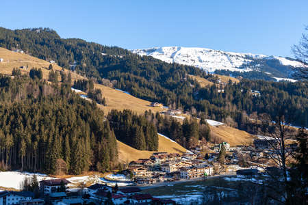Saalbach, Austria - March 5, 2020: Town village street view in downtown of austrian ski resort