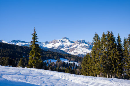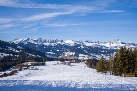 Beautiful day in French alps near small town called Megeve. Winter time in france, snow on mountains, beautiful scenic view.