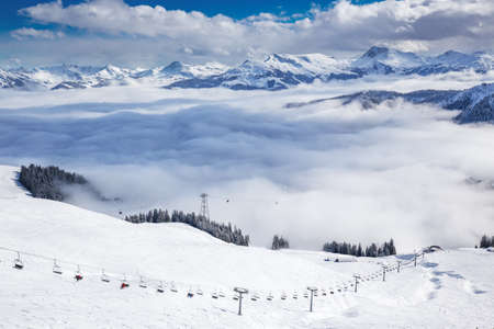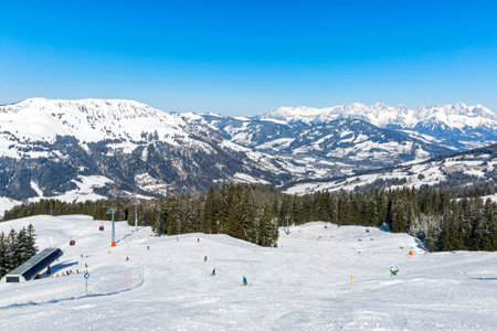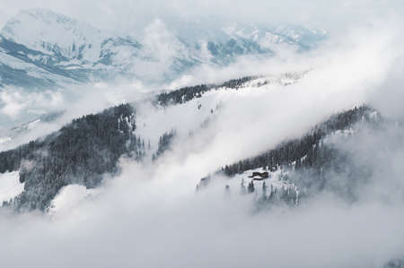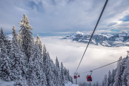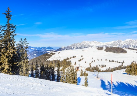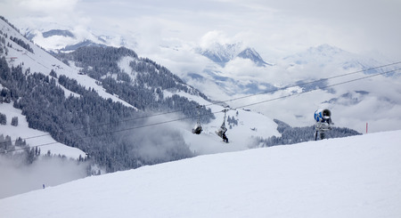 View to Alps in Austria from cable car leading to Hahnenkamm, place of famous hahnenkamm races. Kitzbuehel ski resort is one of the best ski resort in the world with 54 cable cars and 170 km prepared skiing slopes, Tyrol, Austria