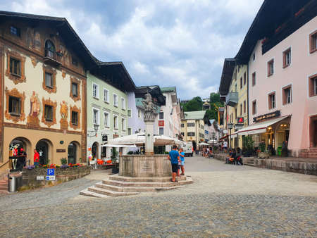 Konigssee, Germany - June 29, 2021: Marktbrunnen fountain at the Marktplatz main square in Berchtesgaden town in Bavaria, Germany