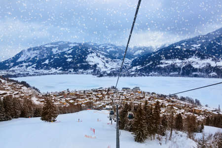 ZELL AM SEE, AUSTRIA - FEBRUARY 28, 2019: The scenic mountain landscapes from the Trassxpress cableway, riding along the snowy slope of Schmitten mount, on February 28 in Zell Am See