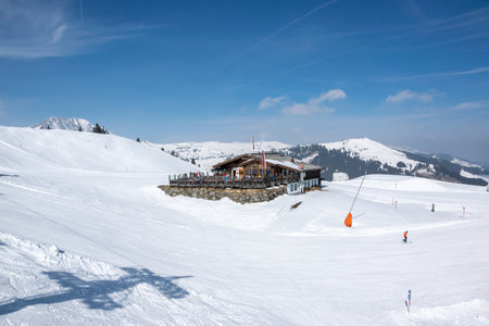 Pass Thurn, Austria - Restaurant for skiers on a ski slope with snow in the mountains in winter.