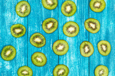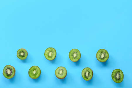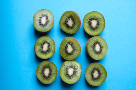 Fresh kiwi slice arrangement on vibrant blue background for healthy living concepts.