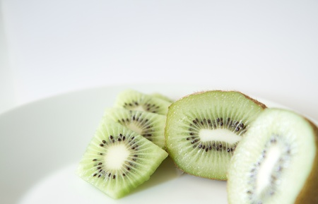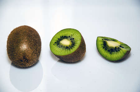 Juicy, tasty kiwi slices. They lie on a bright, light, colored background.