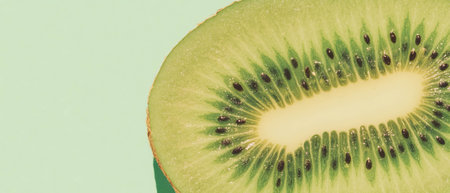 Kiwi, green banner with copy space. Cut fruit on textured grassy background. Monochrome poster with place for text. Organic minimalistic design.