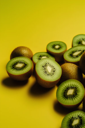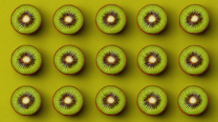 Freshly sliced kiwi arranged on a bright yellow background showcasing vibrant colors and textures