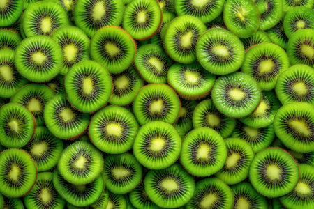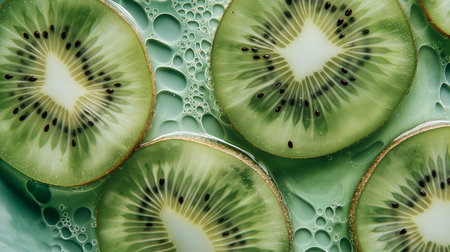 Vibrant close-up of juicy green kiwi slices arranged tightly, showcasing their unique texture and freshness, ideal for healthy food concepts.