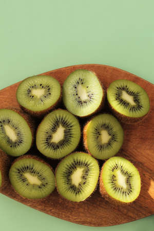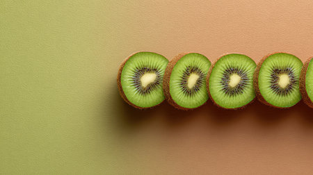 Top view of kiwi fruit aligned in a row with clean background space on the opposite side