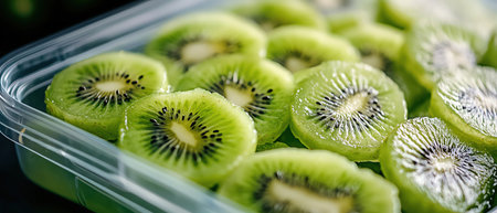 Fresh kiwi slices in a plastic container, vibrant green, healthy snack, closeup, bright and crisp