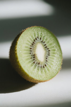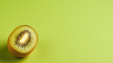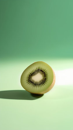 This stunning image features a fresh organic kiwi fruit halved, revealing its vibrant green flesh and black seeds, perfect for healthy dishes, snacks, and culinary inspiration.