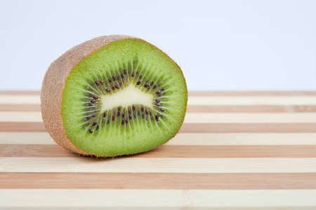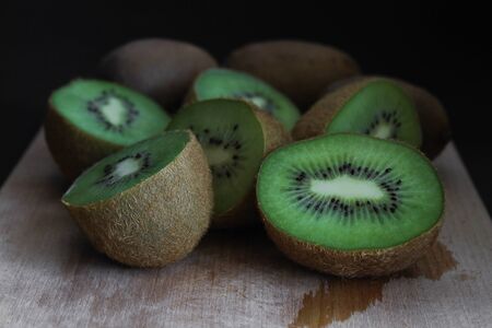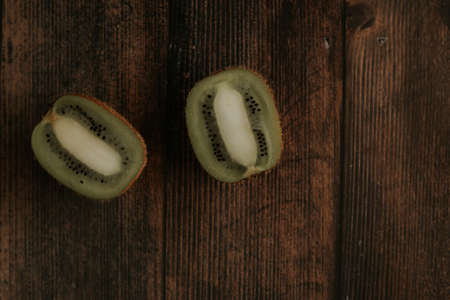 Cut into two halves, the kiwi lies on a wooden background. The kiwi lies on a wooden table. Selectiv focus