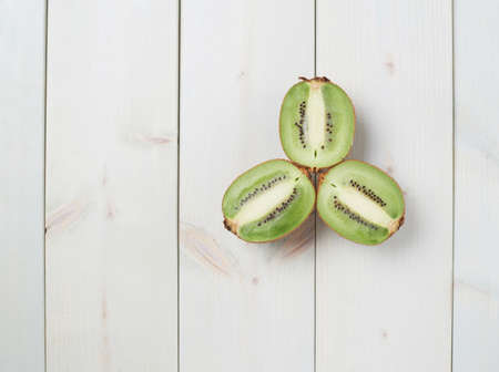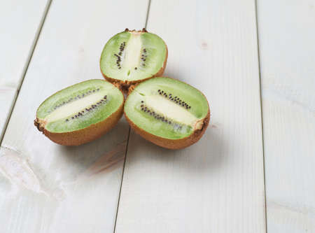 Three sliced halves of kiwifruit or chinese gooseberry kiwi over the white wooden board surface