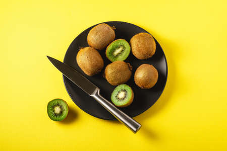 Kiwi fruits half sliced in black plate with kitchen knife on yellow background, top view