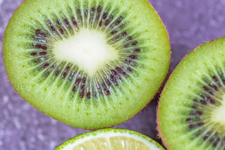 Close-up on the texture of cut fruit kiwi and lime top view.