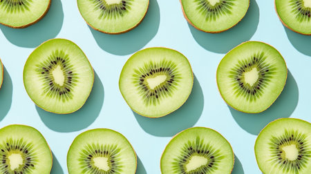Kiwi slices placed in a regular pattern on a pastel blue background, with shadows enhancing the texture and contrast.