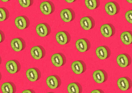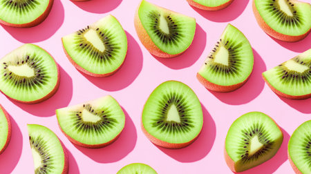A regular pattern of vibrant kiwi slices with soft shadows arranged on a pastel pink background, creating a fresh and playful visual.