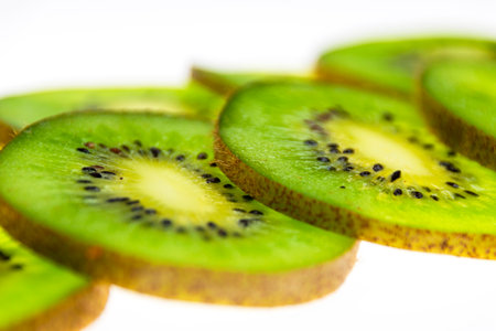 Sliced kiwi fruit arranged on a white background. generated by ai