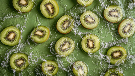A stunning overhead view of fresh kiwi slices surrounded by splashes of water on a vibrant green background, perfect for food styling and healthy eating themes.