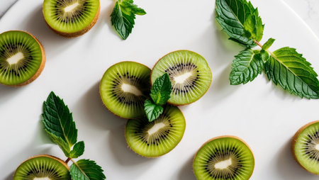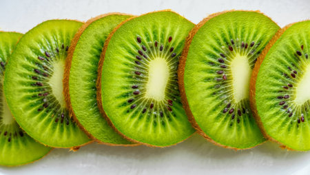 kiwi slices arranged artfully on a rustic wooden tray, showcasing their vibrant green color and intricate brown seeds, perfect for adding a burst of freshness and nutrition to salads, smoothies, or snacks, highlighting the beauty of healthy eating and culinary creativity. ai generated