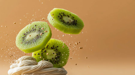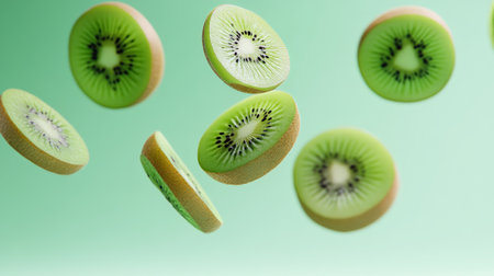 Several slices of fresh kiwi fruit are levitating against a vibrant pastel green backdrop, creating a visually appealing and refreshing scene