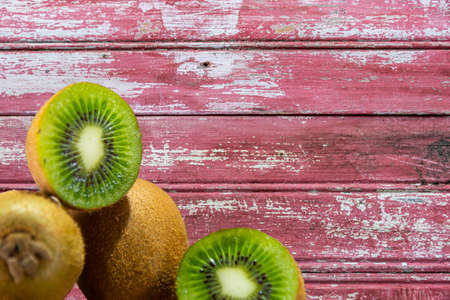 kiwi. sliced. half. fresh. fruit on old wood blue.