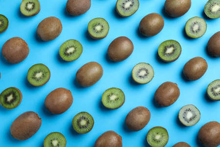 Many cut and whole fresh ripe kiwis on light blue background, flat lay