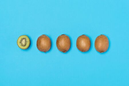 Kiwi Fruit flatlay background. One kiwi isolated amongst the others.