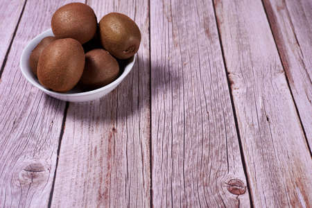 Bowl full of kiwis on wooden planks. Free space, front ridge, old wood,
