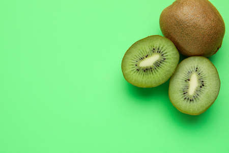Kiwi fruit on a green background with copy space. top view. Generative AI
