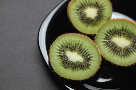 Three halves of fresh kiwi fruit in a black plate on black background.