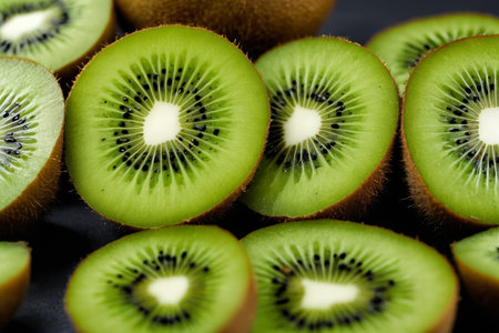 Freshly sliced kiwi fruit pieces arranged in a visually appealing pattern. the vibrant green flesh, delicate seeds, and contrasting textures make it perfect for themes related to healthy eating, summer refreshment, and natural beauty. Generative AI