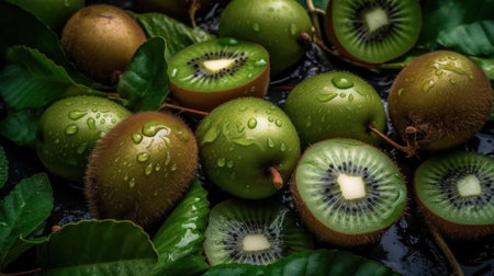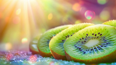 Delight in the vibrant beauty of fresh kiwi slices arranged artfully against a sparkling backdrop, capturing the essence of health and freshness.