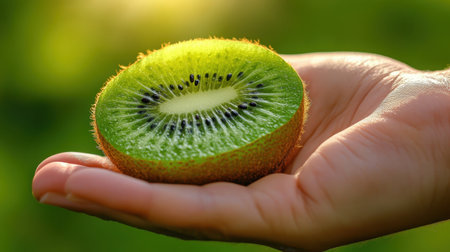 A human hand holds a vibrant slice of kiwi against a soft-focus natural background, capturing the essence of healthy eating and fresh produce.