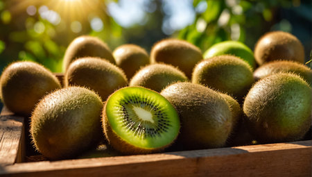Whole ripe kiwi fruits with one sliced piece revealing the fresh green inside. Great for healthy lifestyle visuals, nutrition themes, organic food and supermarket advertising.