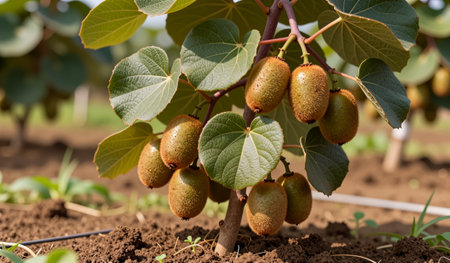 Lush green leaves surround plump kiwi fruit nestled on a young tree. The warm sun shines over the fertile orchard, signaling an abundant harvest ready for picking.