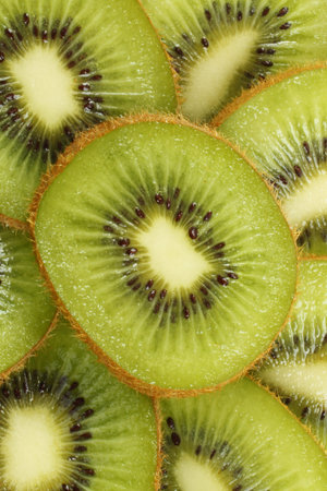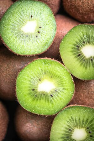 Ripe fresh kiwi fruits sliced as textured background, protein load.