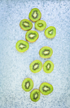 Kiwi fruit slices, green fruit flat lay.